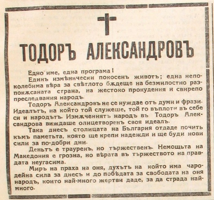 Тялото на Тодор Александров положили в Пирин планина, над Роженския манастир. Столицата също не останала безучастна към голямото поклонение пред легендарния водач на Вътрешната македонска революционна организация. 18 септември 1924 година бил избран за ден на траур. Целият град застинал, затворени били всички магазини, македонските братства и организации разлепили навсякъде некролози с портрета на Александров.